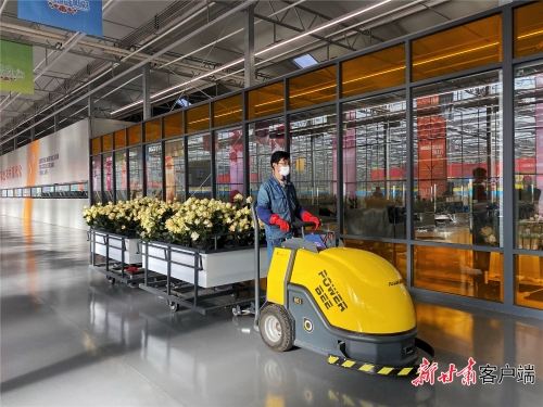 临夏百益亿农国际鲜花港工人采摘鲜花运送至包装区。新甘肃·甘肃日报记者 王虎 摄