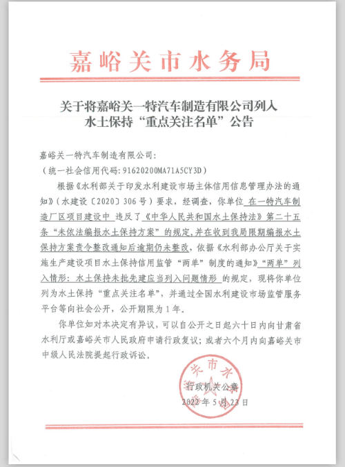 关于将嘉峪关一特汽车制造有限公司列入水土保持“重点关注名单”公告