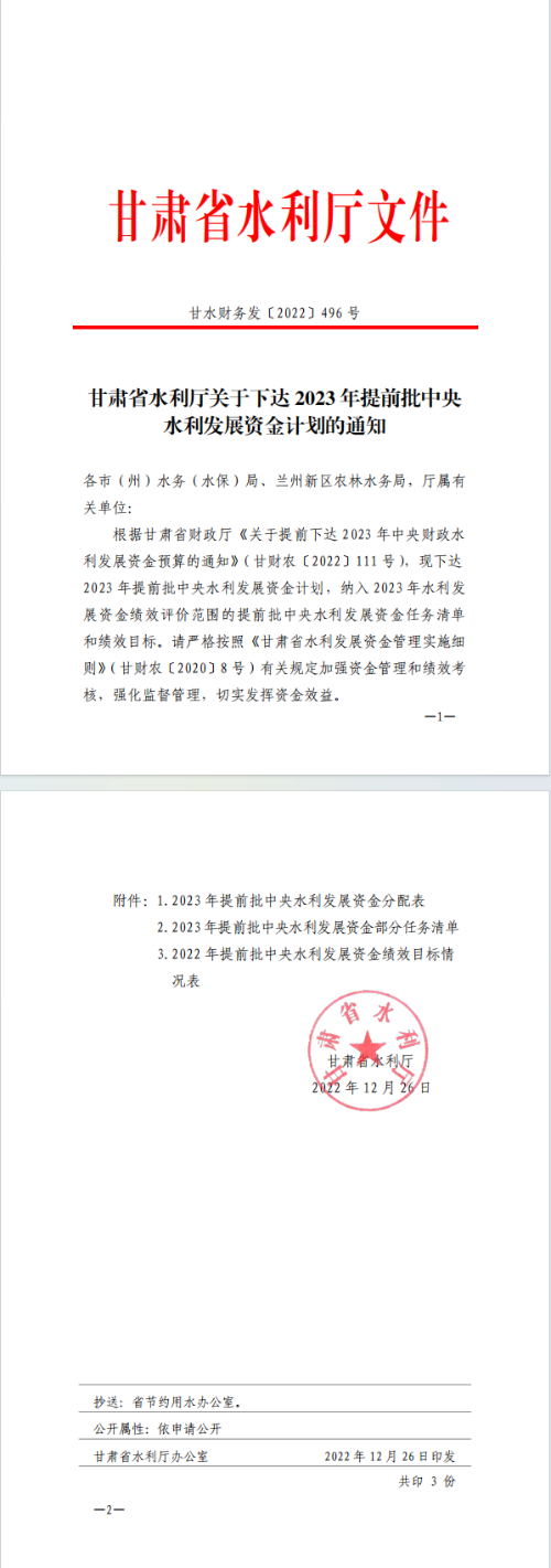 甘肃省水利厅关于下达2023年提前批中央水利发展资金计划的通知