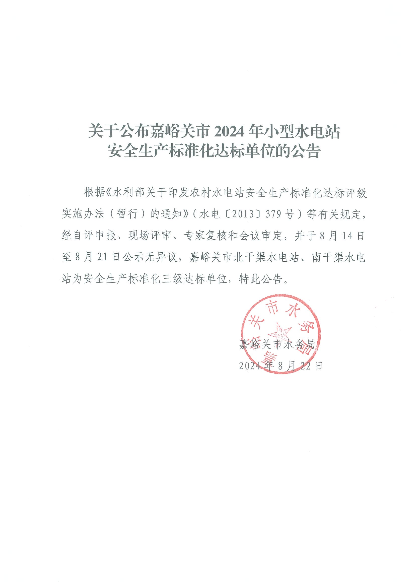 关于公布嘉峪关市2024年小型水电站安全生产标准化达标单位的公告