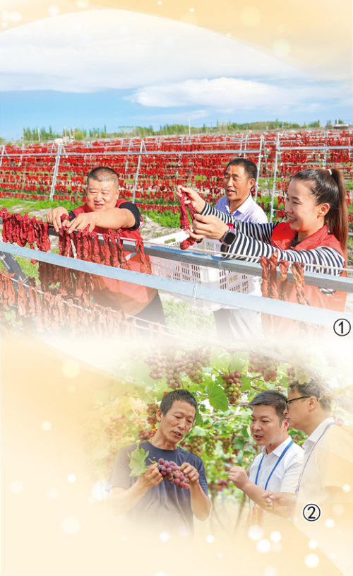 图①:新疆维吾尔自治区博湖县塔温觉肯乡辣椒晒场上,党员志愿服务队帮助村民晾晒辣椒。 |