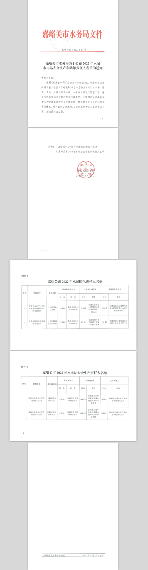 嘉峪关市水务局关于公布2022年水闸水电站安全生产和防汛责任人名单的通知