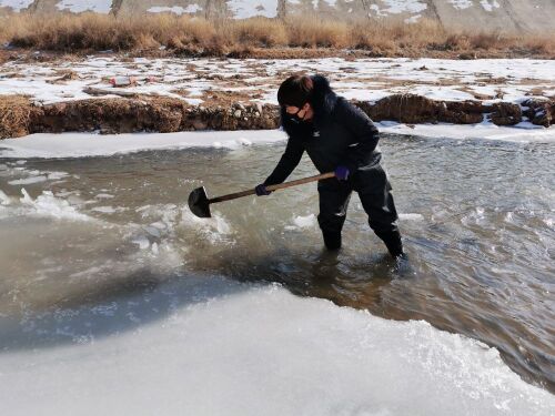 冬季河流封冻,凿冰测流得靠人工。每月两次测流时,大家握着仪器、系紧安全绳,在河面上每隔一米凿开一个冰窟窿,将测量仪器放置水下施测。河水酷寒,即便用三四层厚袜子、棉裤撑满雨裤,咬紧牙关坚持也撑不了十分钟便会冻透。