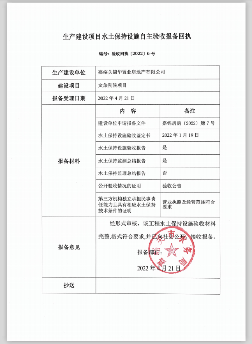 文旅别院项目生产建设项目水土保持设施自主验收报备回执
