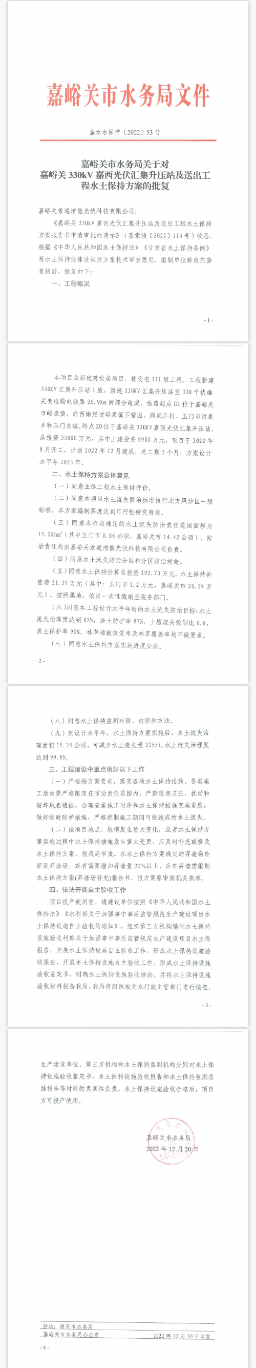 嘉峪关市水务局关于对嘉峪关330KV嘉西光伏汇集升压站及送出工程水土保持方案的批复