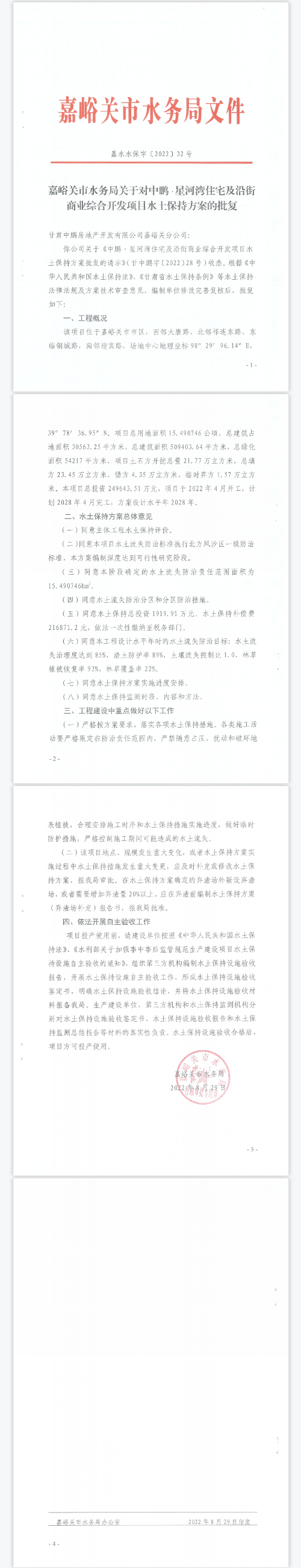 嘉峪关市水务局关于对中鹏·星河湾住宅及沿街商业综合开发项目水土保持方案的批复