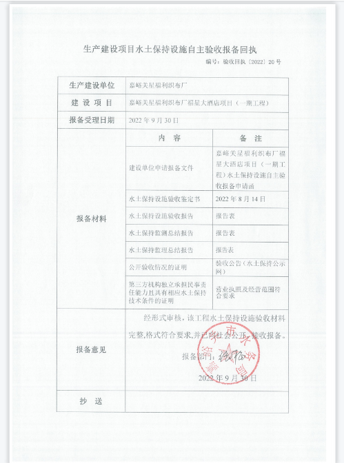 嘉峪关星福利织布厂福星大酒店项目(一期工程)生产建设项目水土保持设施自主验收报备回执