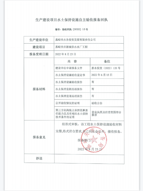 嘉峪关市新城镇供水水厂工程生产建设项目水土保持设施自主验收报备回执