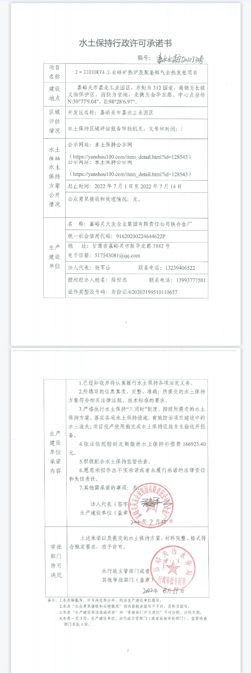 2×33000KVA工业硅矿热炉及配套烟气余热发电项目水土保持行政许可承诺书