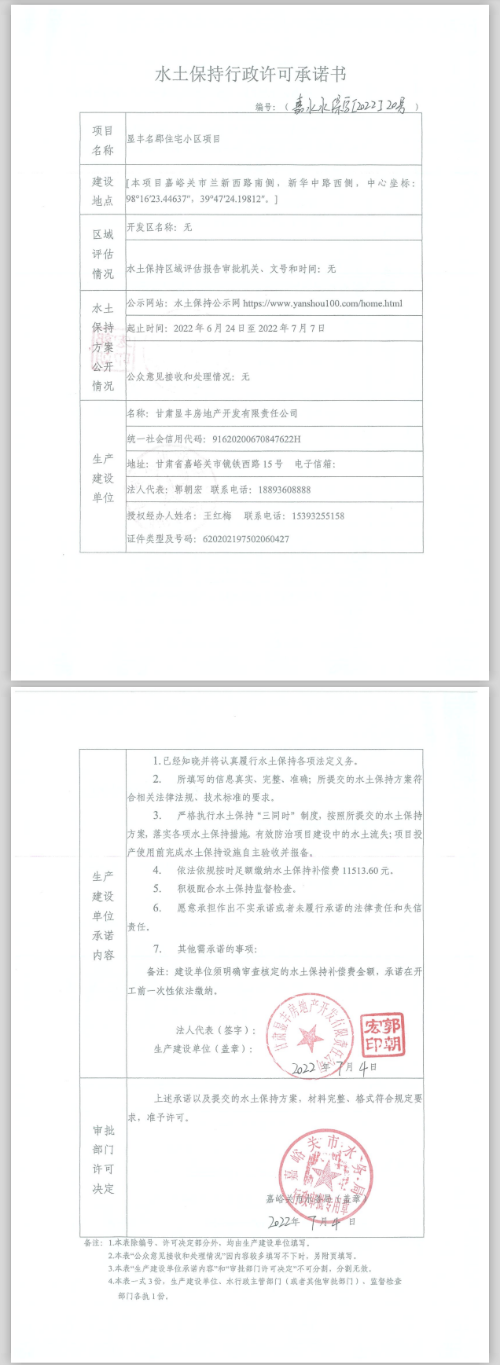 显丰名郡住宅小区项目水土保持行政许可承诺书