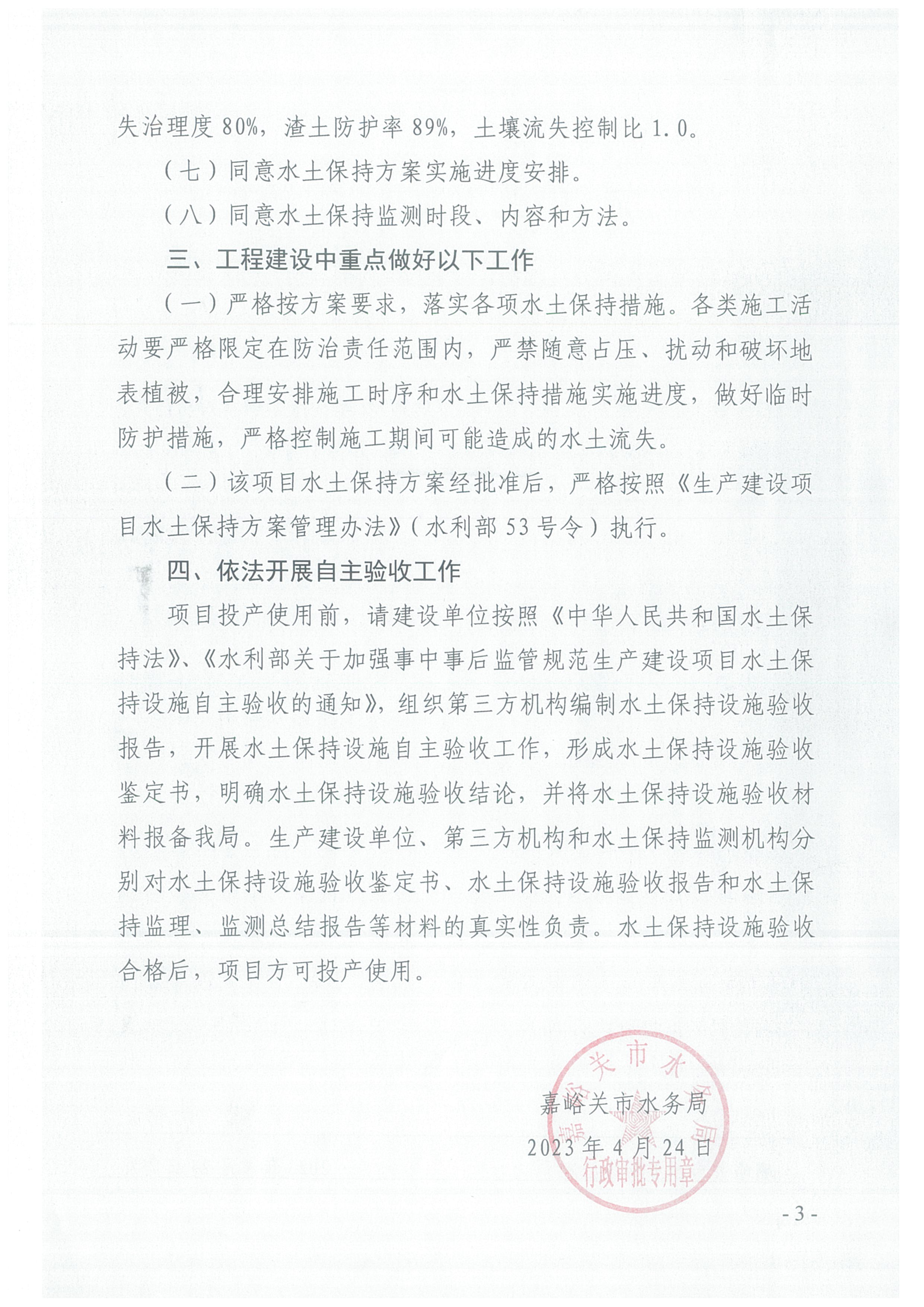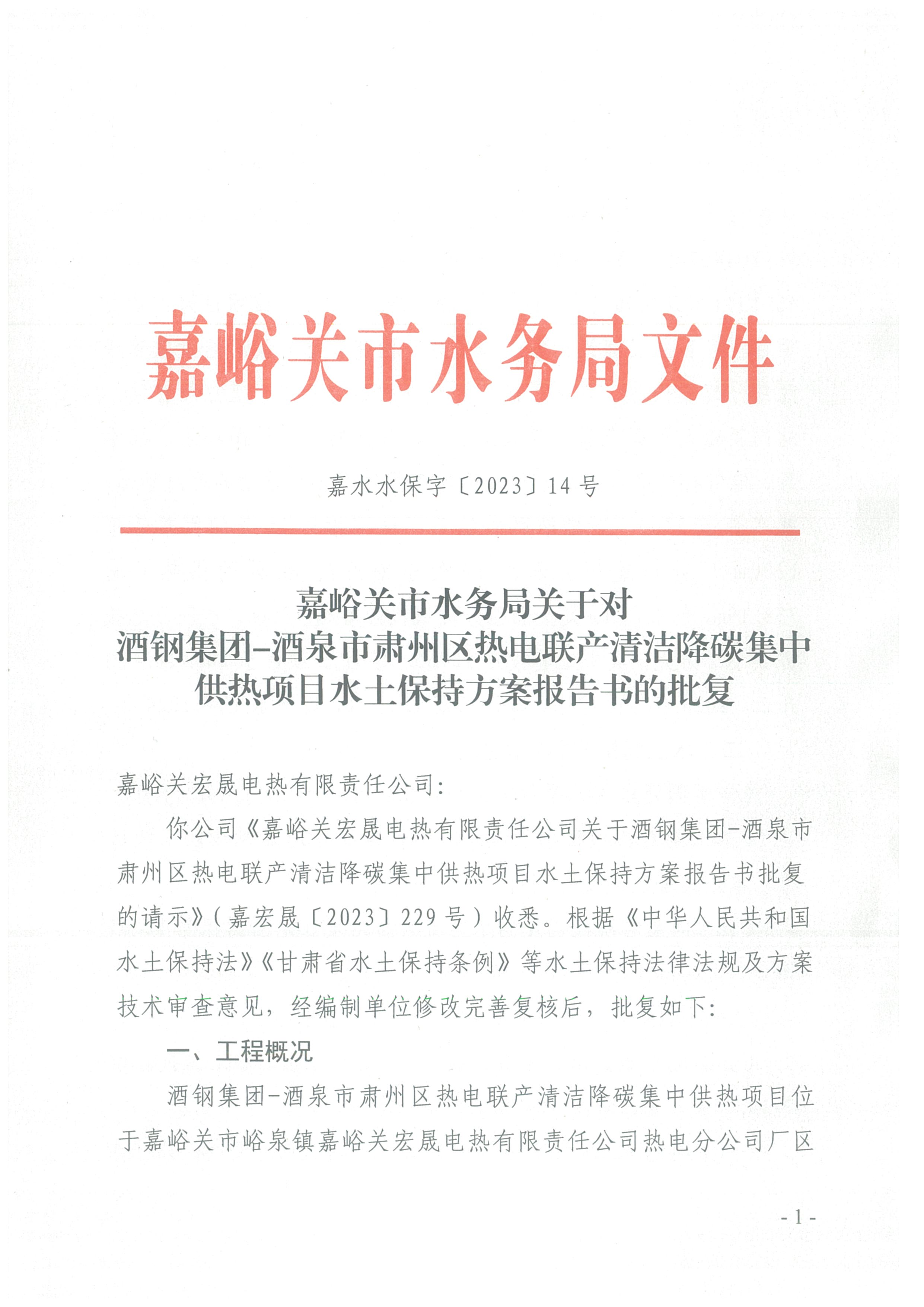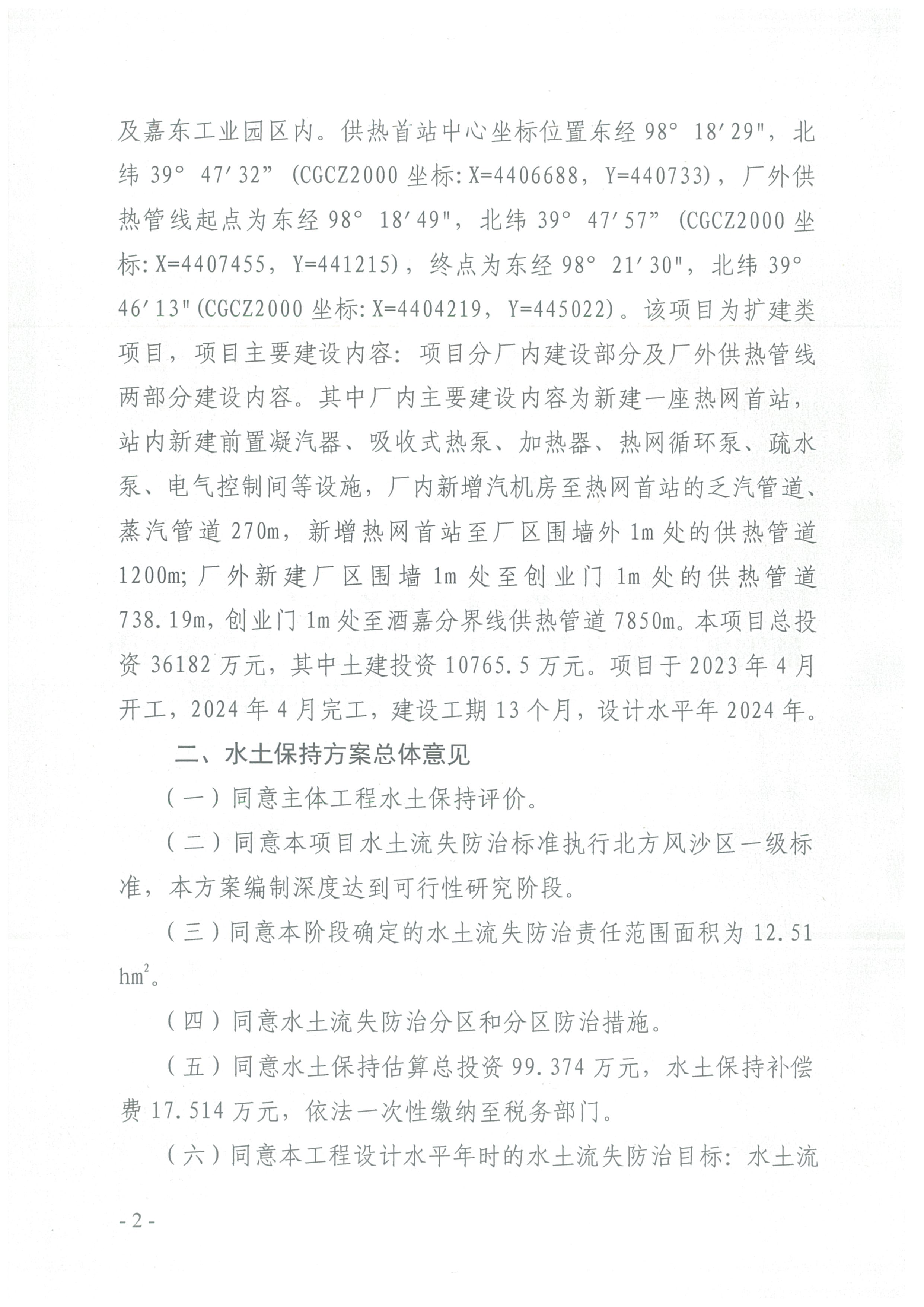 嘉峪关市水务局关于对酒钢集团-酒泉市肃州区热电联产清洁降碳集中供热项目水土保持方案报告书的批复