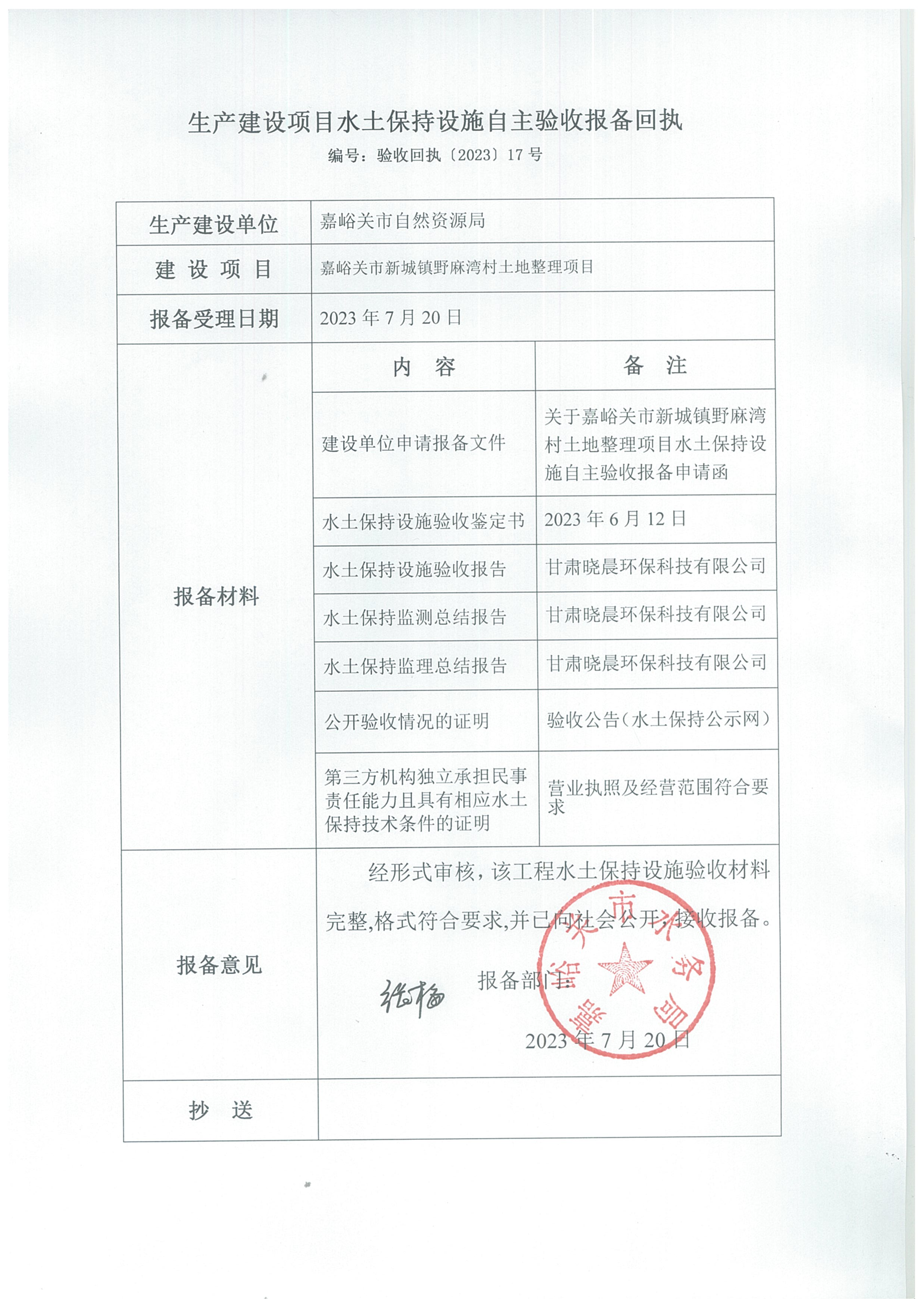 嘉峪关市新城镇野麻湾村土地整理项目生产建设项目水土保持设施自主验收报备回执