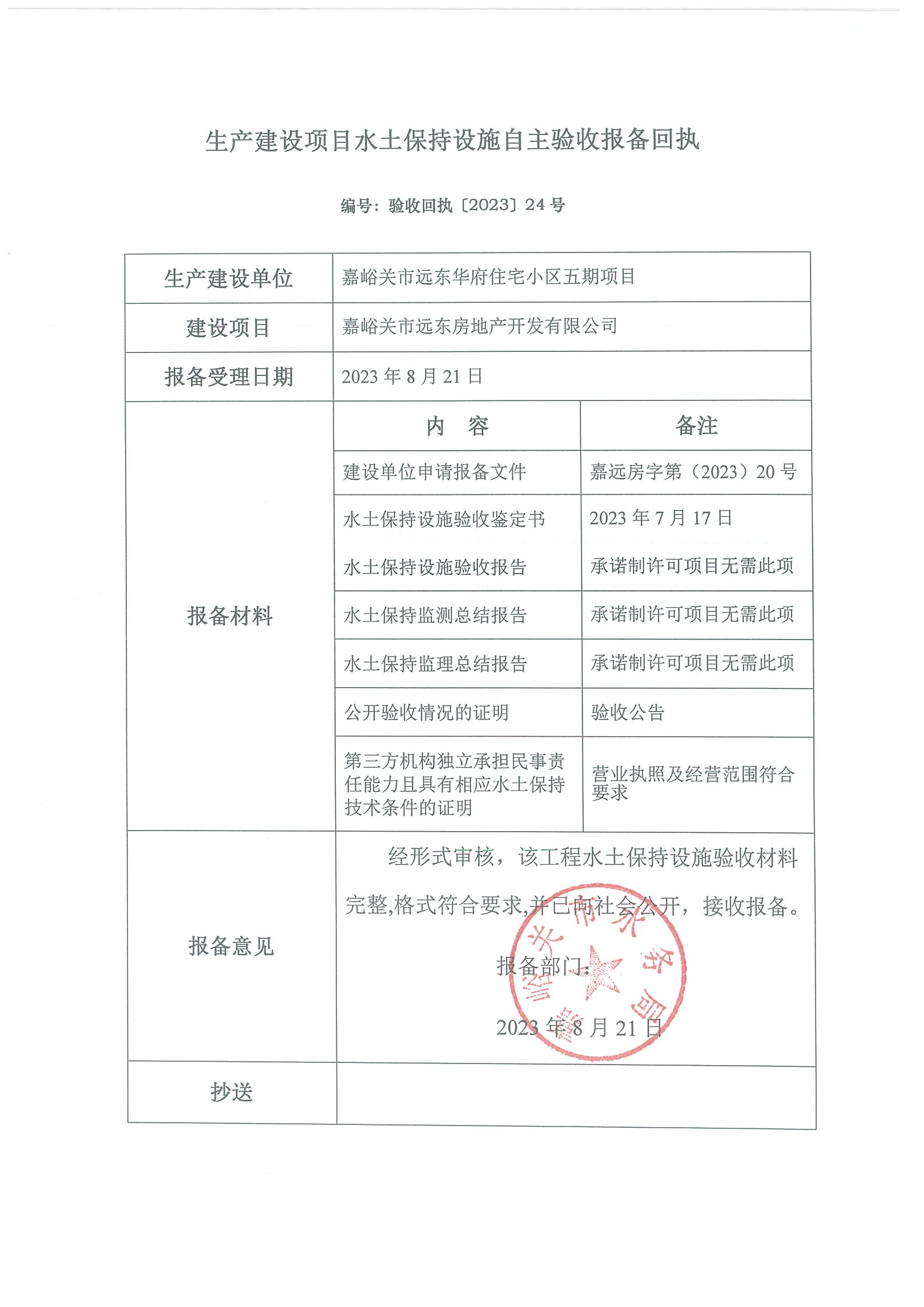 嘉峪关市远东华府住宅小区五期项目生产建设项目水土保持设施自主验收报备回执