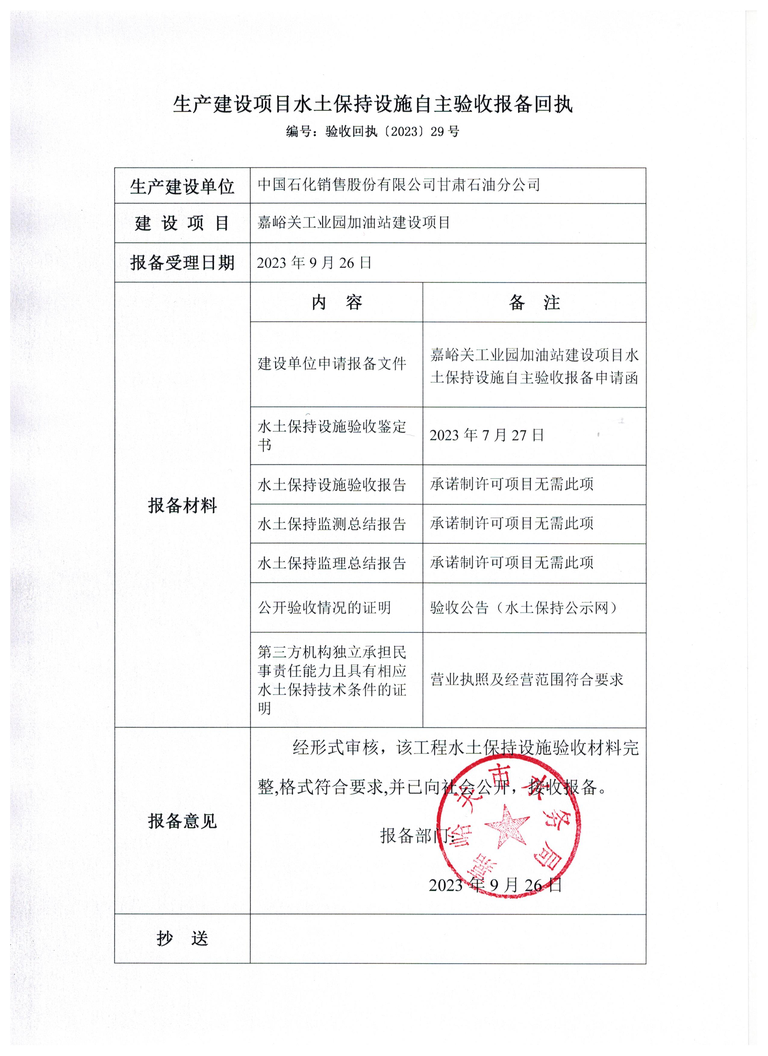嘉峪关工业园加油站建设项目生产建设项目水土保持设施自主验收报备回执