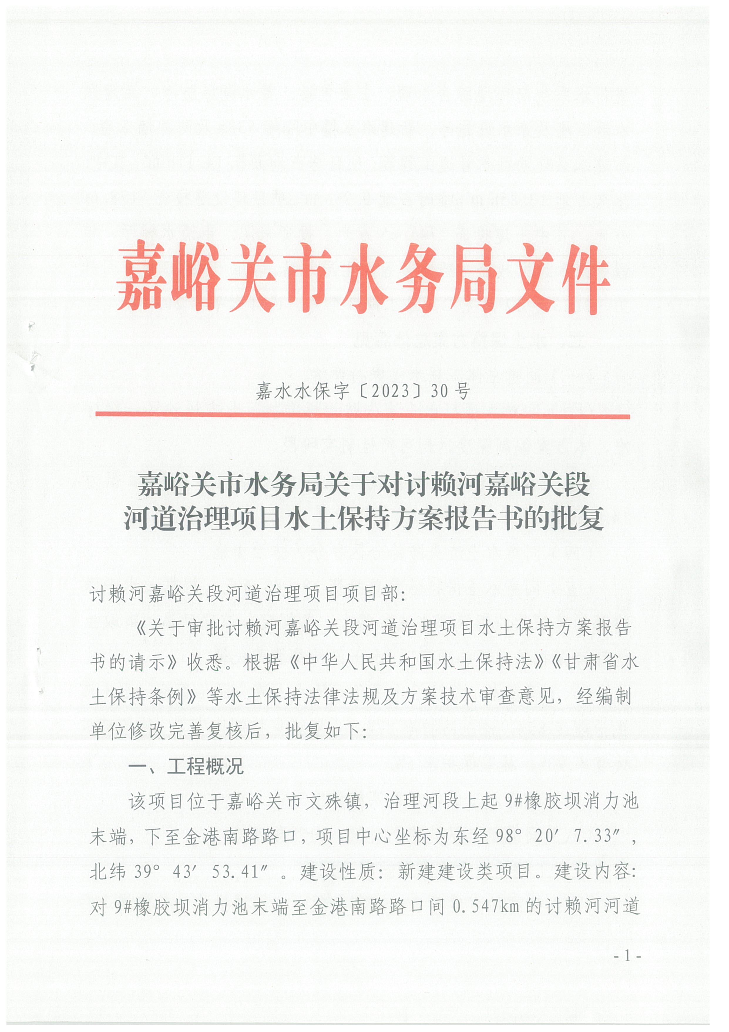 嘉峪关市水务局关于对讨赖河嘉峪关段河道治理项目水土保持方案报告书的批复