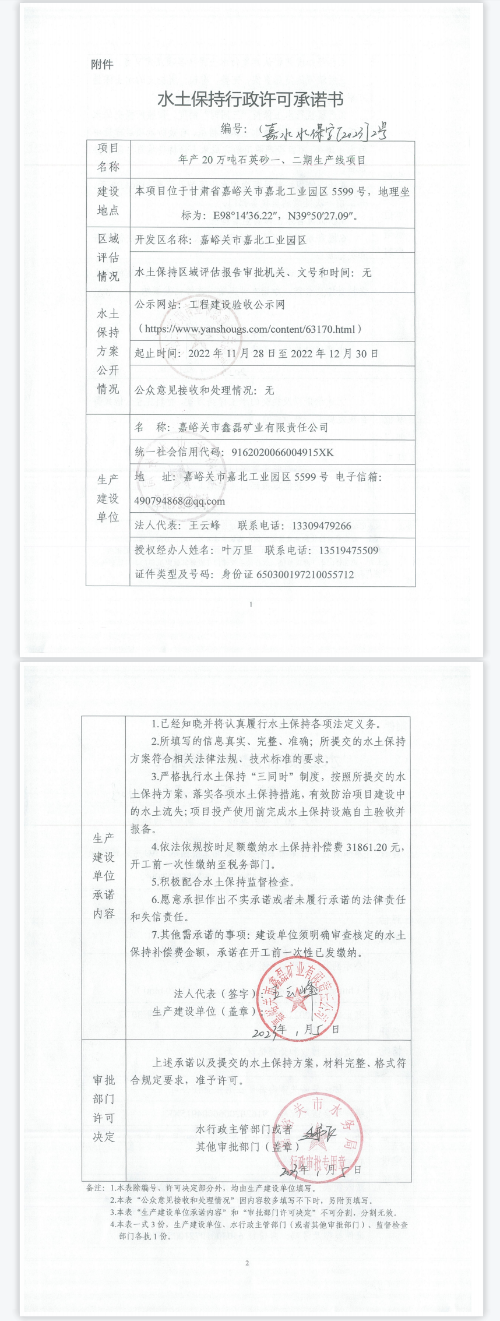 年产20万吨石英砂一、二期生产线项目水土保持行政许可承诺书
