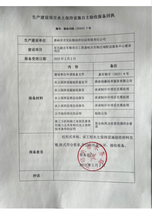 军民融合军粮供应工程嘉峪关军粮区域配送服务中心建设项目生产建设项目水土保持设施自主验收报备回执