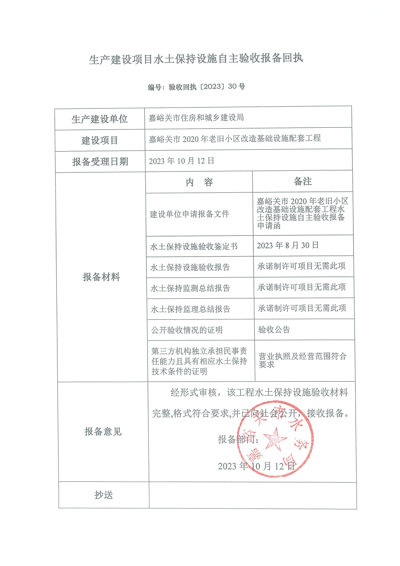 嘉峪关市2020年老旧小区改造基础设施配套工程生产建设项目水土保持设施自主验收报备回执