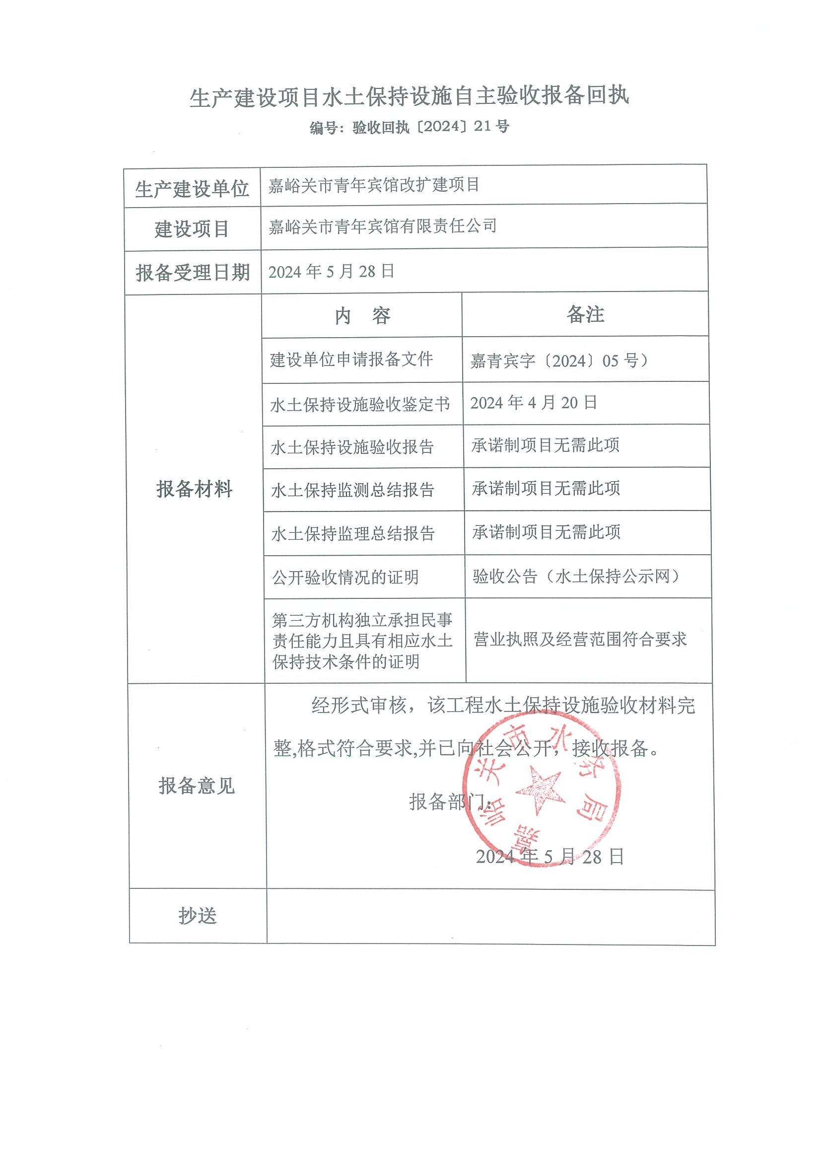 嘉峪关市青年宾馆有限责任公司生产建设项目水土保持设施自主验收报备回执