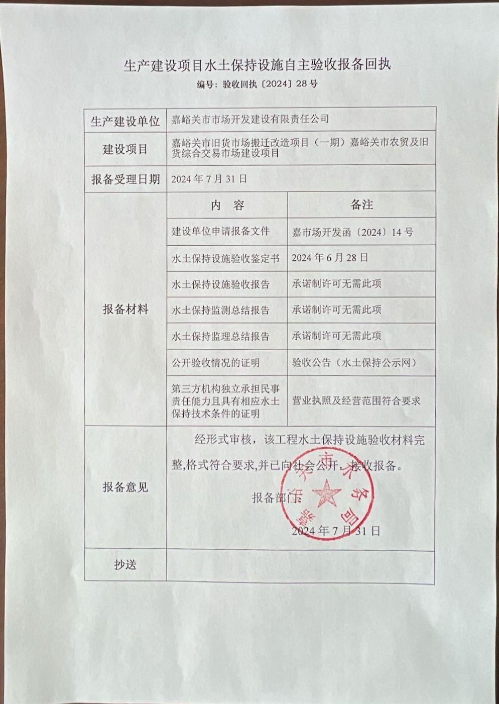 嘉峪关市旧货市场搬迁改造项目(一期)嘉峪关市农贸及旧货综合交易市场建设项目生产建设项目水土保持设施自主验收报备回执