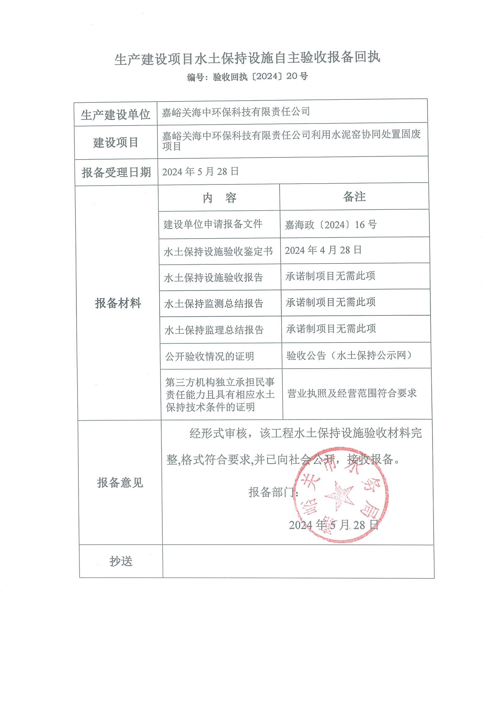嘉峪关海中环保科技有限责任公司利用水泥窑协同处置固废项目生产建设项目水土保持设施自主验收报备回执