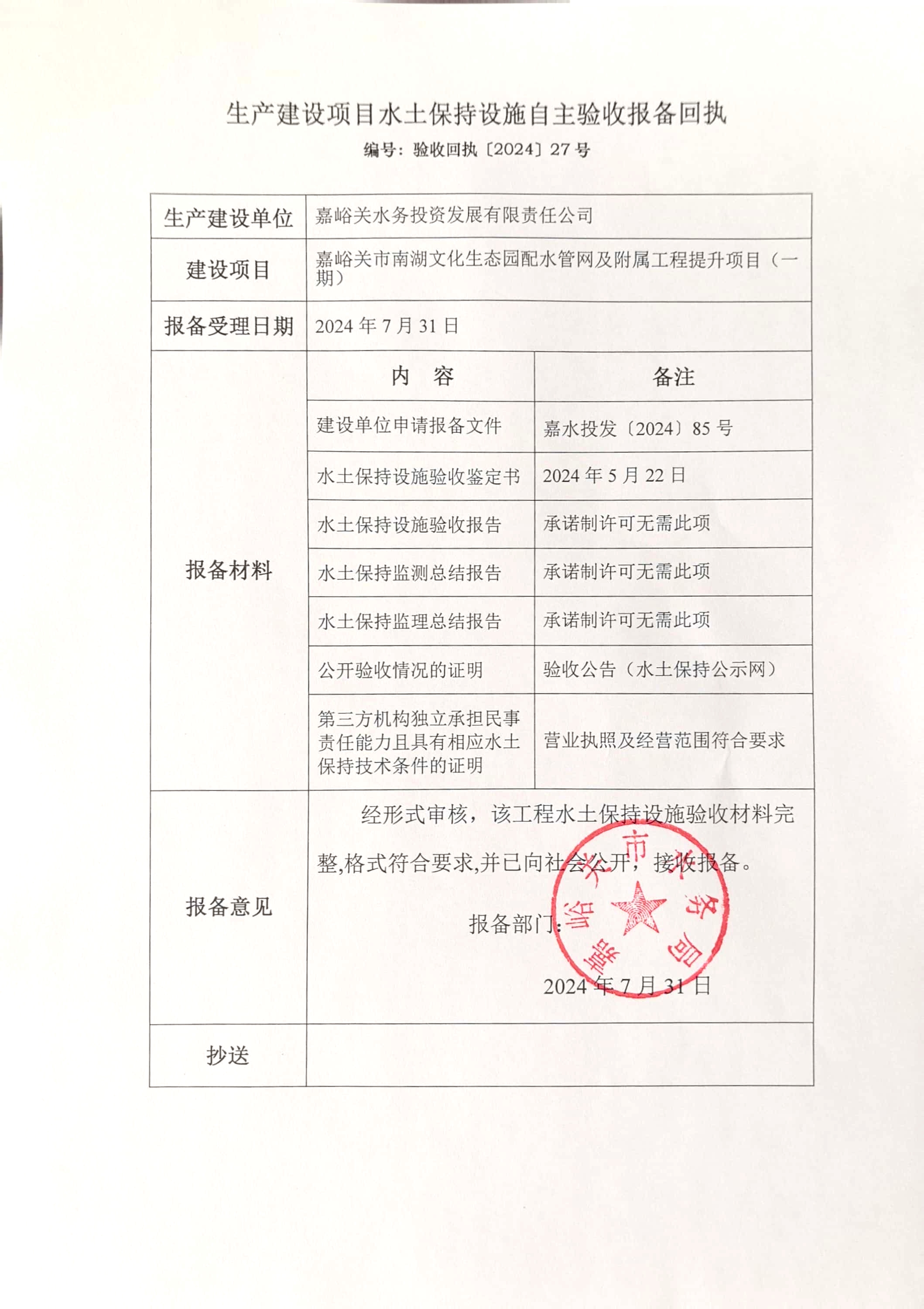 嘉峪关市南湖文化生态园配水管网及附属工程提升项目(一期)生产建设项目水土保持设施自主验收报备回执