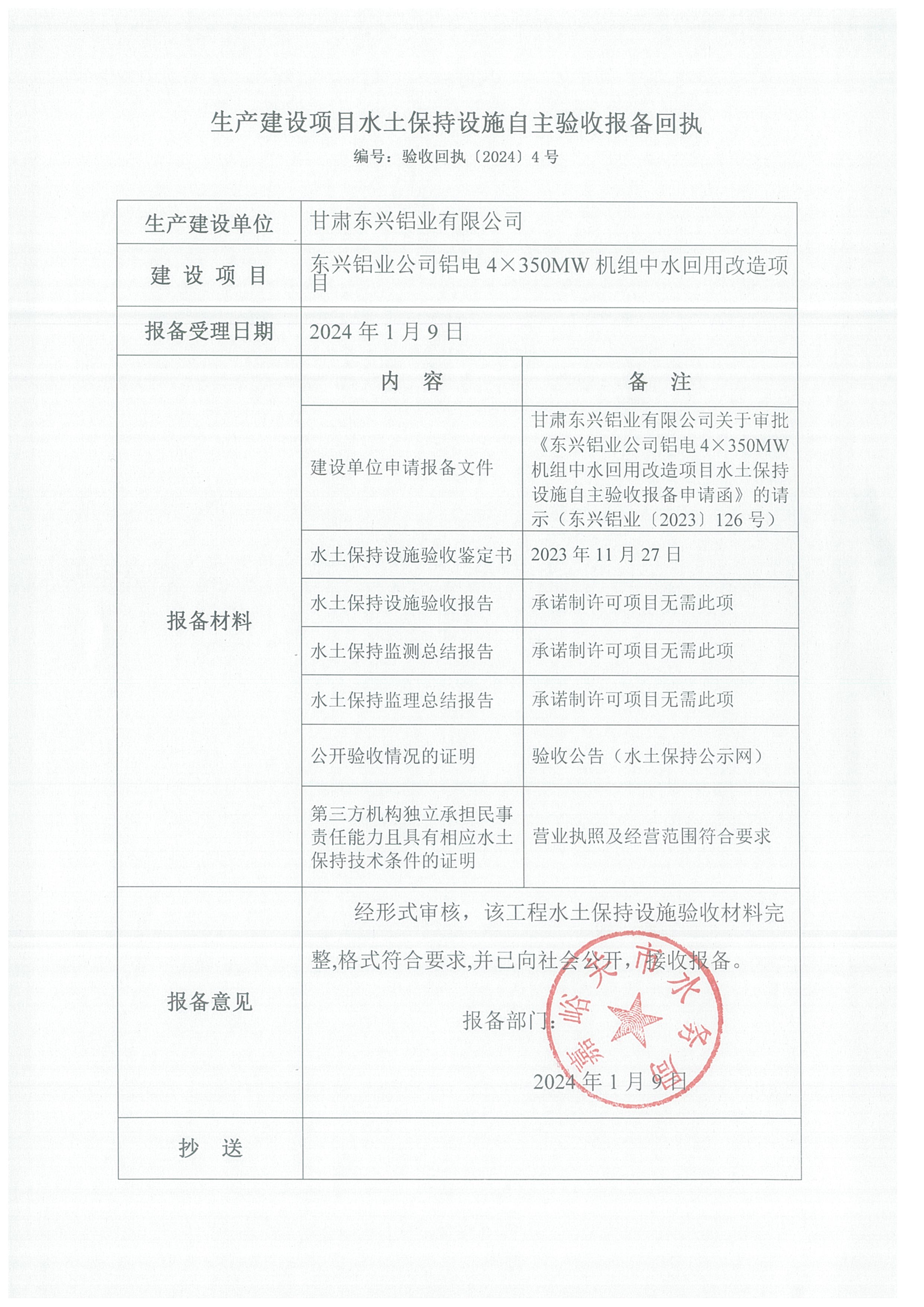 东兴铝业公司铝电4×350MW机组中水回用改造项目生产建设项目水土保持设施自主验收报备回执