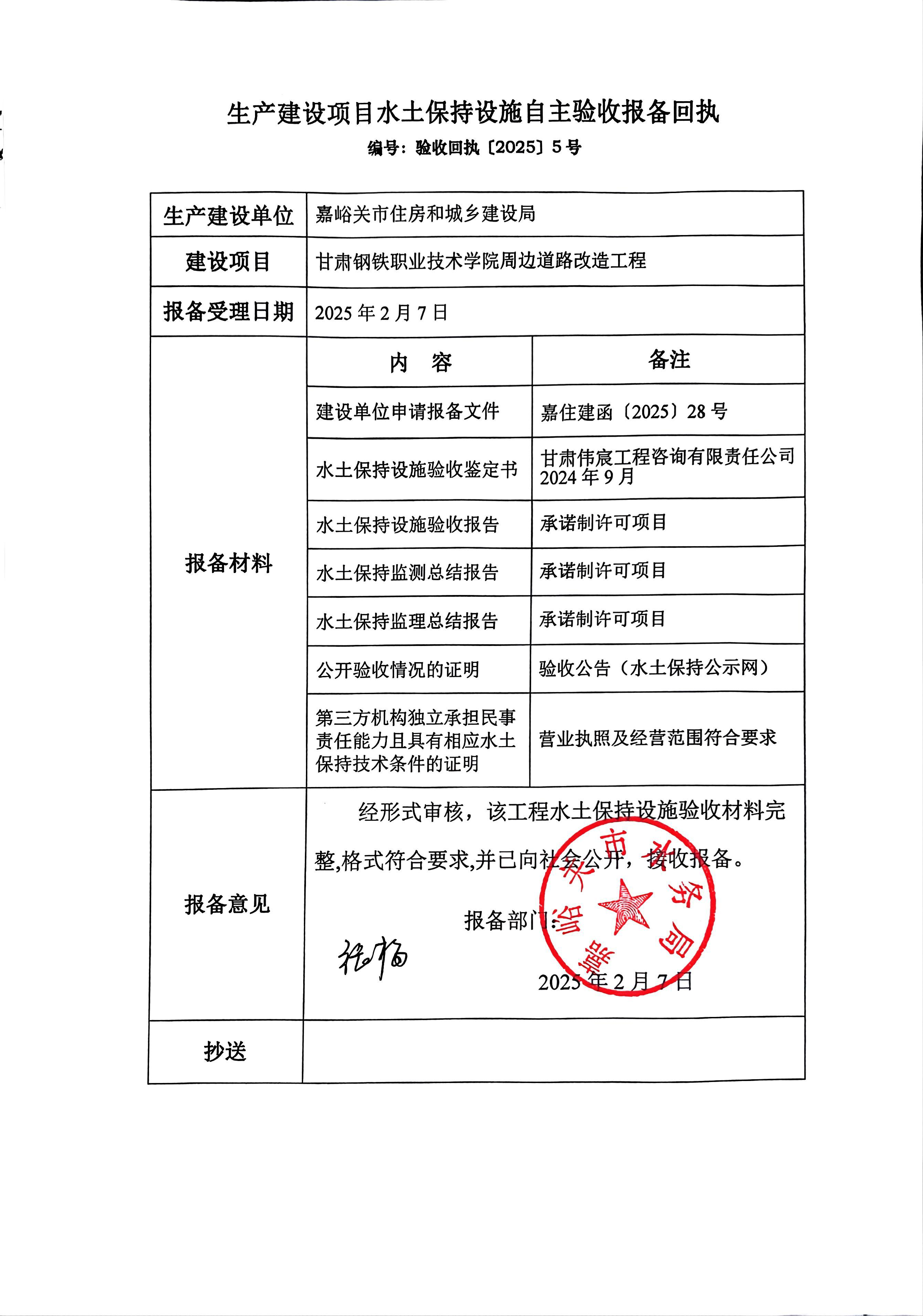 甘肃钢铁职业技术学院周边道路改造工程生产建设项目水土保持设施自主验收报备回执