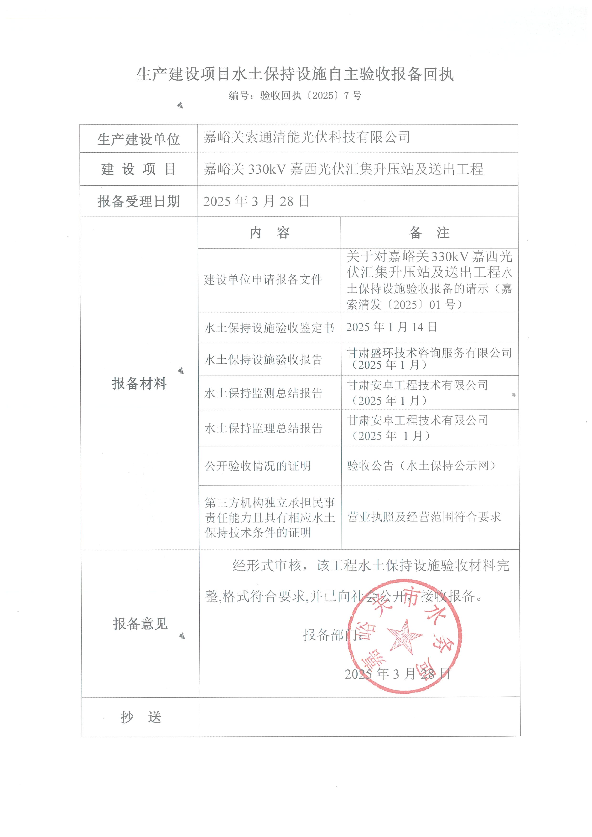 嘉峪关330kV嘉西光伏汇集升压站及送出工程生产建设项目水土保持设施自主验收报备回执