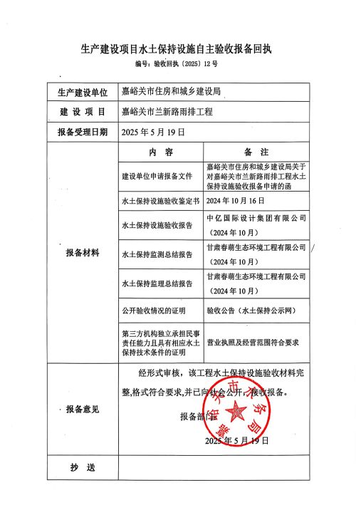 嘉峪关市兰新路雨排工程生产建设项目水土保持设施自主验收报备回执