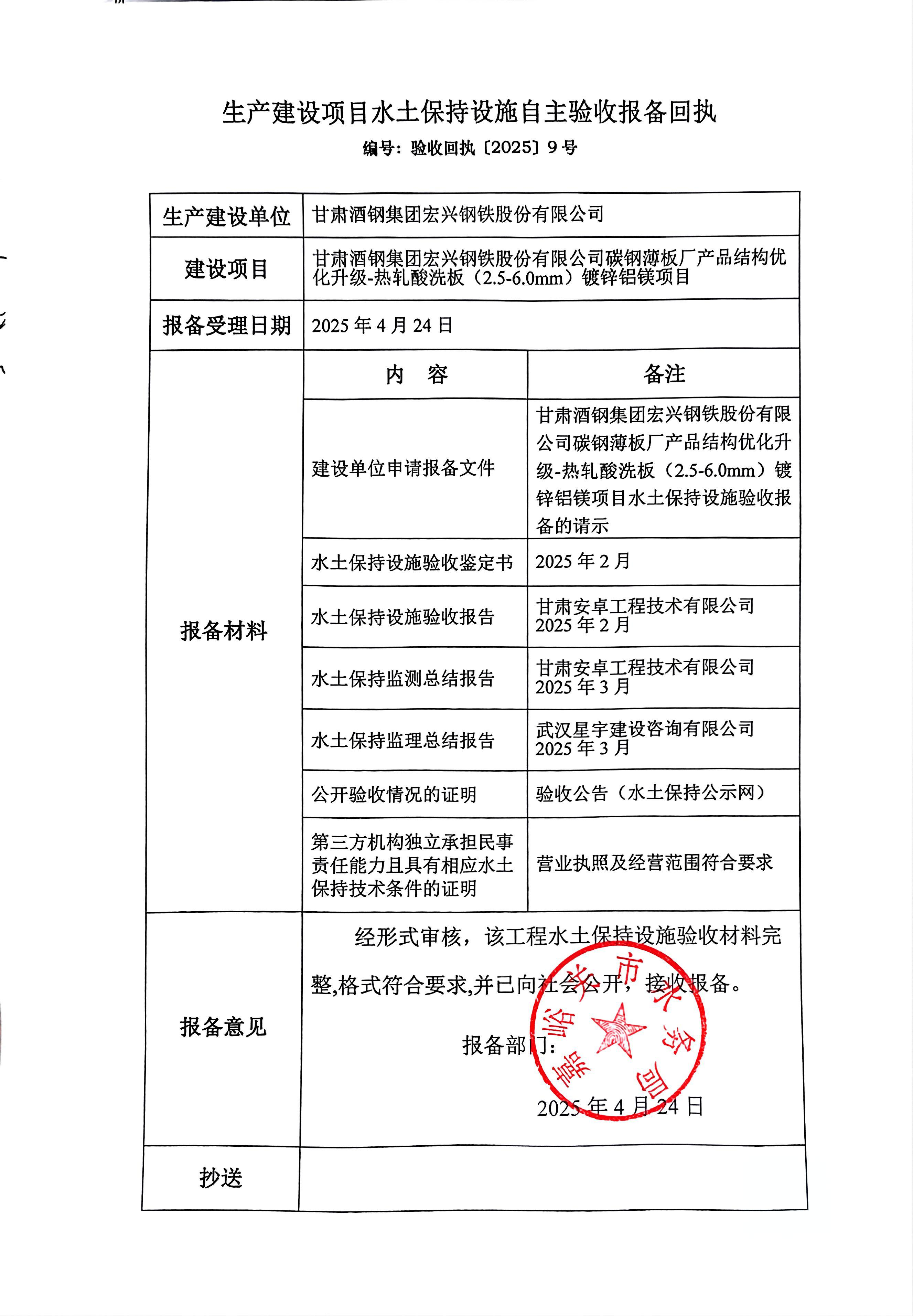 甘肃酒钢集团宏兴钢铁股份有限公司碳钢薄板厂产品结构优化升级-热轧酸洗板(2.5-6.0mm)镀锌铝镁项目生产建设项目水土保持设施自主验收报备回执