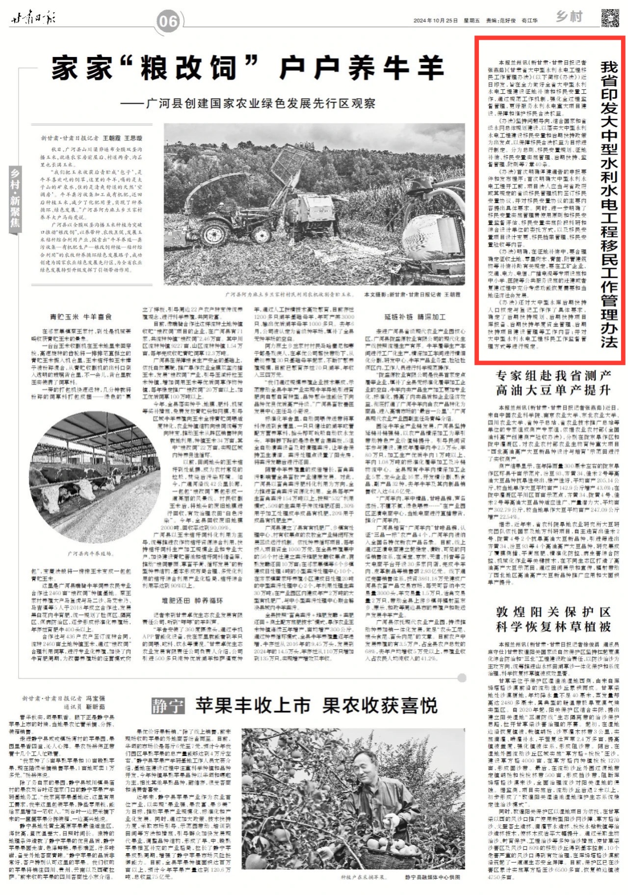 【甘肃日报】《甘肃省大中型水利水电工程移民工作管理办法》印发