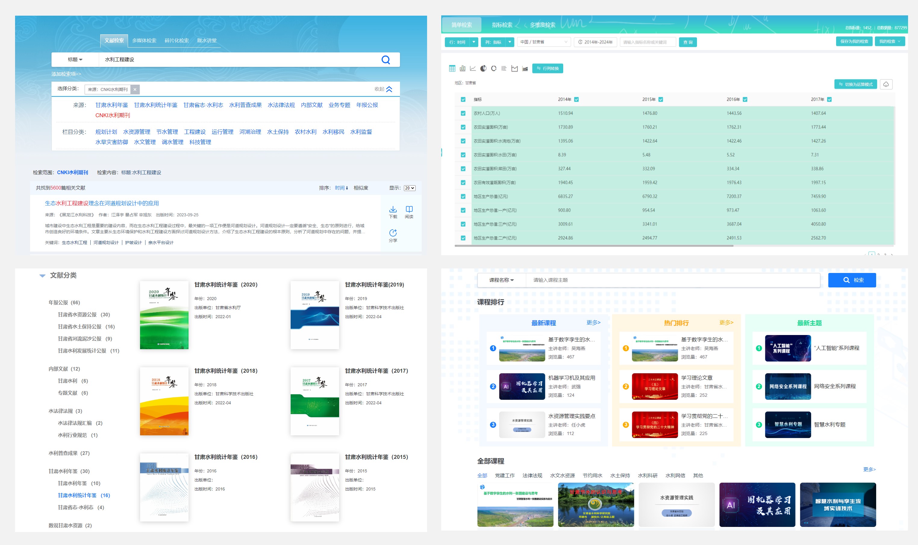 我们的资源信息收集工作堪比汇聚百川之力,构建了甘肃水利专属知识库,成功整合了丰富的水利信息资源,包括水利志、水利普查成果、标准规范、期刊等共166本文献。我们的文献库中包含约7000篇碎片化文献,近1.2万张图片,约3000张素材图片,近6000张表格。此外,陇水讲堂的在线课程超过60堂,引入知网水利期刊912万余篇。我们的数据库中现有1452个指标,数据量达到了惊人的87.7万条,形成知识检索、书籍浏览、陇水讲堂、数值数据、CNKI水利期刊等5大功能模块,提供丰富的在线数字化资源共享服务。