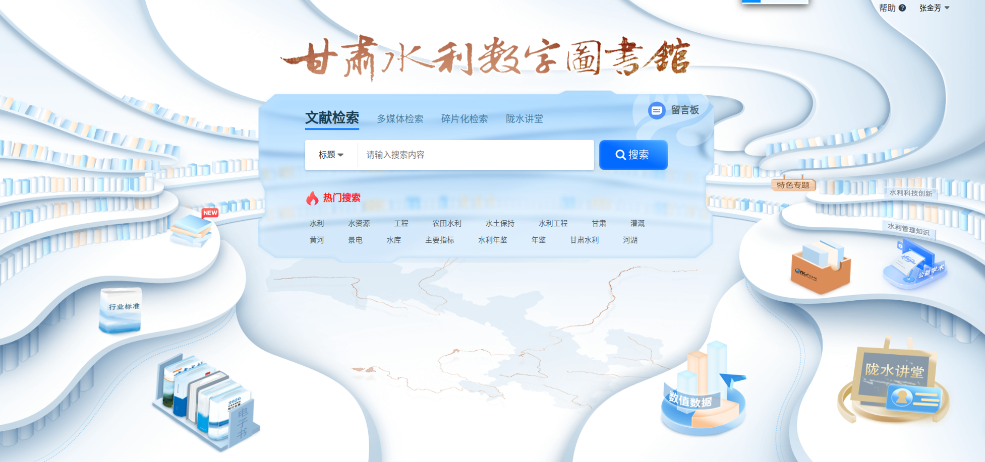 欢迎来到甘肃水利数字图书馆,这是甘肃省水利厅信息中心依托甘肃智慧水利工作平台精心开发打造,通过收集、整合、收录、编目全省水利海量文献信息资源,为全省5万水利职工提供一个全面、准确、自由获取知识的丰富平台,我们的目标是:创造一个信息量庞大、形式多样、动态馆藏、更新迅速、智能便捷、资源共享的水利专业数字图书馆。