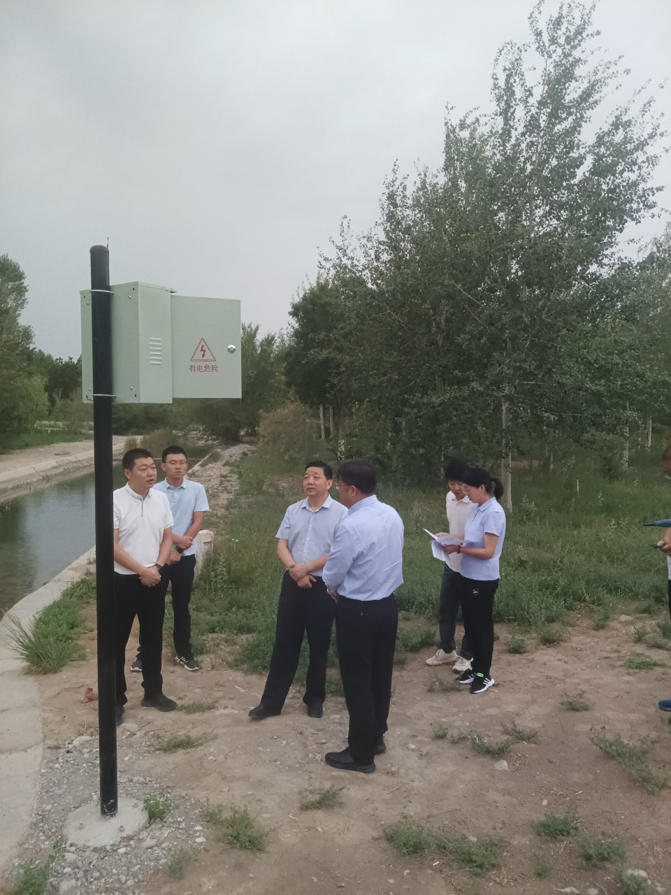 (图为在两湖一河输水渠道入口查看计量设施安装情况)