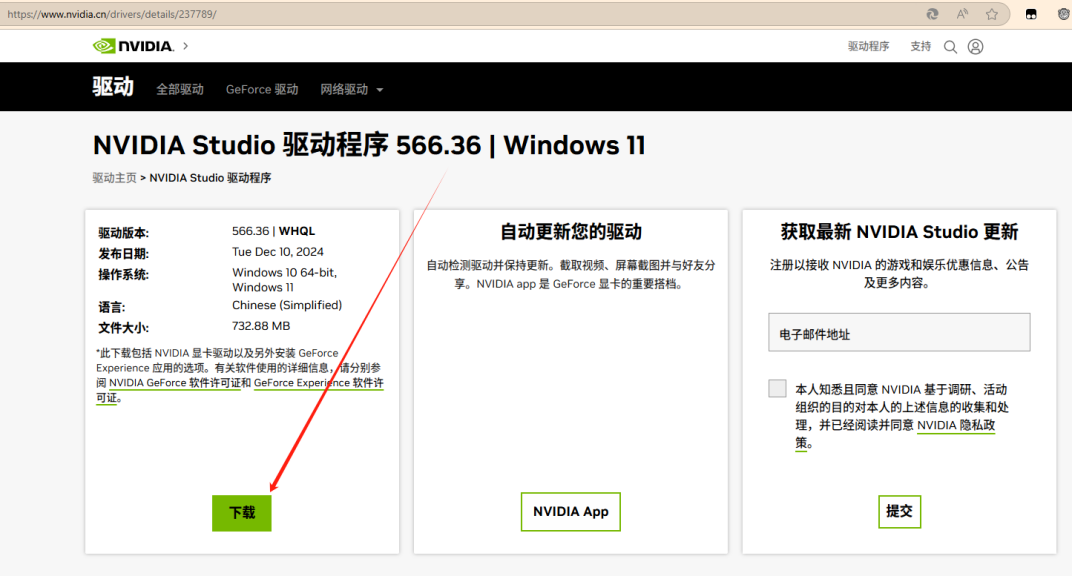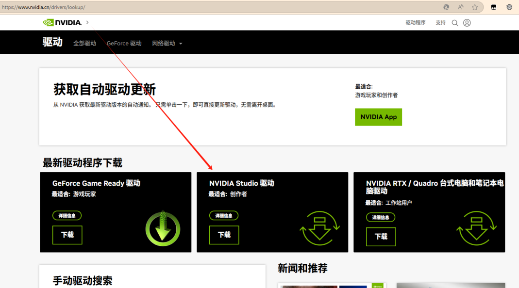 ① 显卡驱动:官网下载并安装NVIDIA Studio 驱动