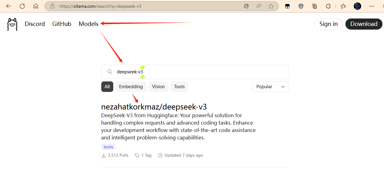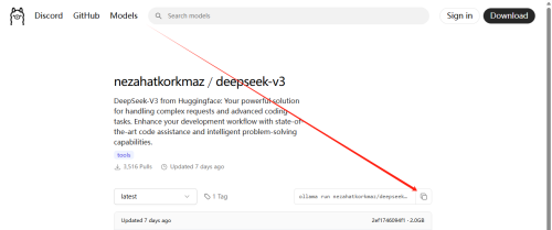 点击上图的“nezahatkorkmaz/deepseek-v3”打开连接,如下图所示: