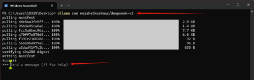 看到上图提示后,表示这个大模型已经下载完毕了!其他大模型的下载也可如法炮制即可。其实,如果此时在命令行中输入问题,大模型已经可以回答问题了。但是因为在字符界面,效果并不理想。可按ctrl+d快捷键即可退出并回到正常的提示符。