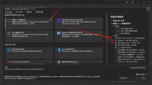 启动后等待下载完整安装包,待进入安装界面后,选择使用c++的桌面开发,默认选项如下图: