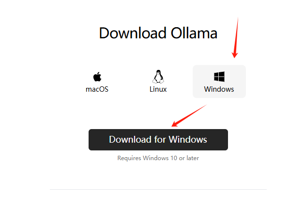 下载地址:Ollama(ctrl+鼠标左键点击蓝色连接即可打开网页,下同)