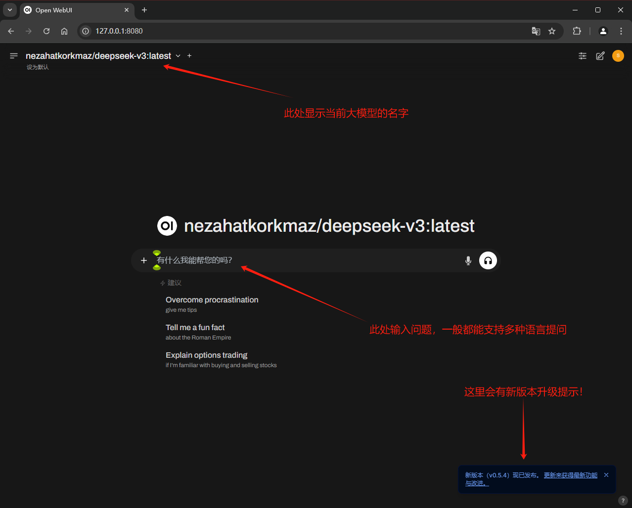至此,本地化大模型就可以运行了!如果已经下载了多个大模型,则可以在左上角点开下拉菜单,随时切换成其他大模型。如果右下角有如图所示的升级提醒,则可以在终端窗口执行open-webui的升级命令。系统默认是深色模式,通过设置也可以修改其他预制的配色方案。