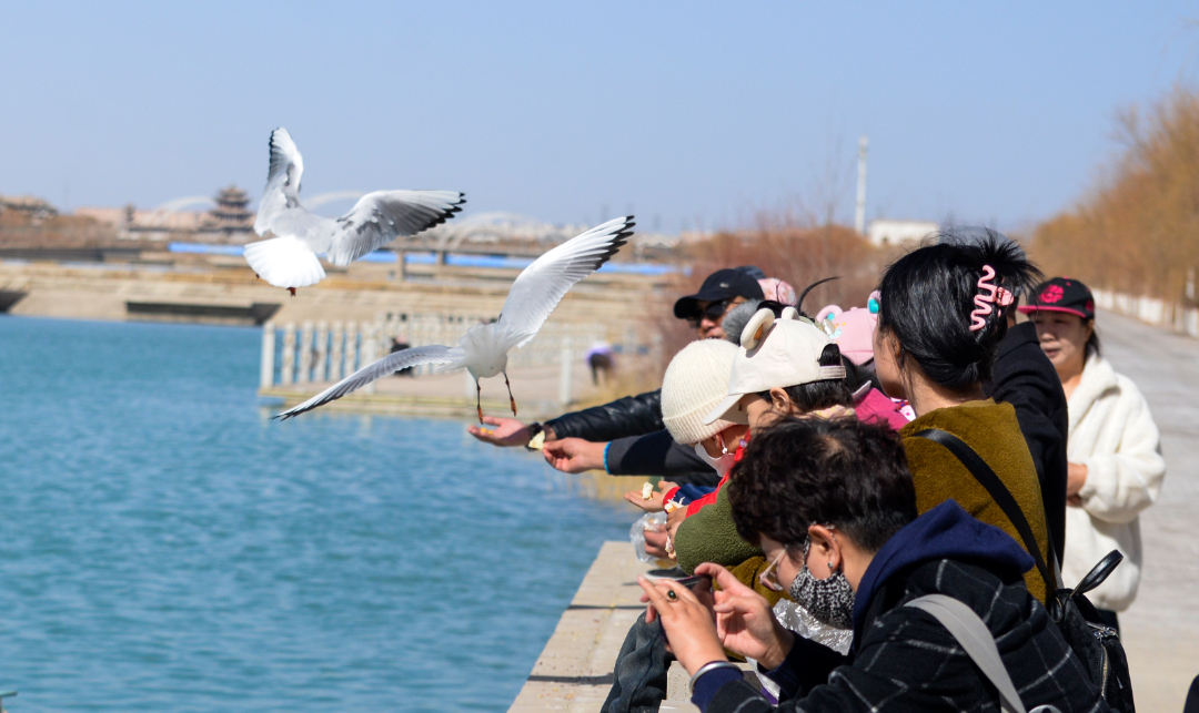 成群红嘴鸥、渔鸥、遗鸥在南湖讨赖河公园嬉戏翔鸣、起舞觅食,众多市民朋友们驻足围观,与这群精灵互动,俨然勾勒出了一幅人与自然和谐共生的温馨画面。春暖气息愈见浓烈,嘉峪关草湖国家湿地公园冰雪消融,引来成群灰鹤、灰雁、赤嘴潜鸭、赤麻鸭、绿头鸭、白骨顶鸡纷纷打卡,嘉峪关市迎来了候鸟迁徙的高峰期。