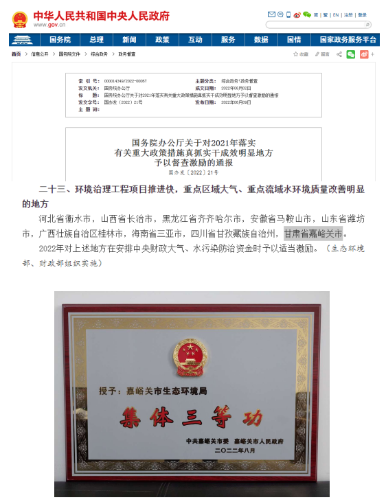 良好的生态环境并非一日之功,在于日日、月月、年年孜孜以求。长期以来,嘉峪关市立足工业旅游城市的实际深入实施“生态立市”战略,取得了生态环境稳步改善,部分指标跻身全国、全省前列的优异业绩。“治气、治水、治土”工作取得阶段性成果,市民对良好生态环境的获得感显著提升。2022年6月,国务院对2021年落实有关重大政策措施真抓实干成效明显地方予以督查激励,嘉峪关市荣获“环境治理工程项目推进快,重点区域大气、重点流域水环境质量改善明显的地方”督查激励,受到生态环境部、省政府通报表扬。