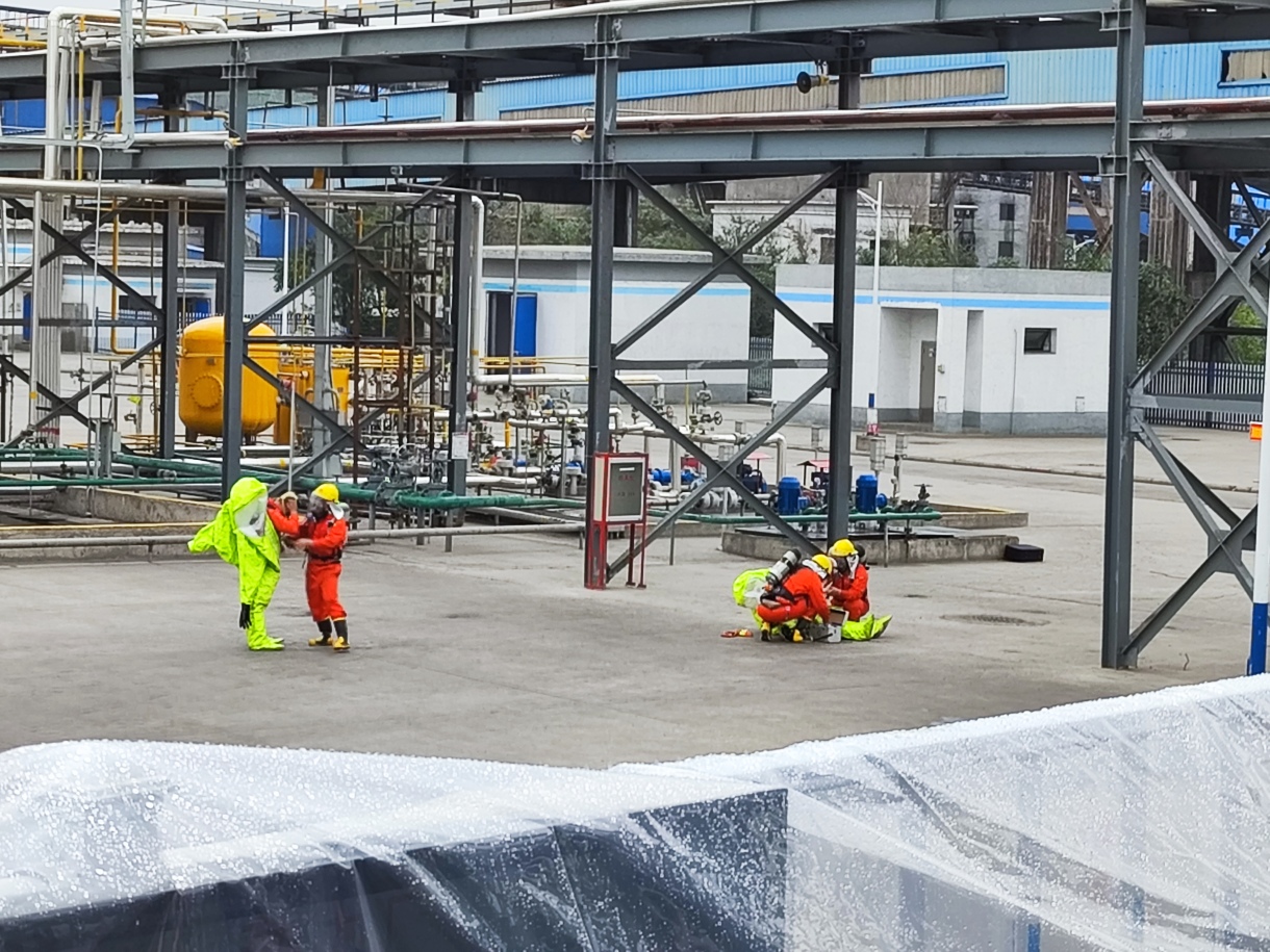 此次演练旨在检验各级突发环境事件应急预案和政企协作应急处置能力。本次演练模拟生产安全事故次生突发环境事件,演练等级为一般突发环境事件。演练情景模拟危化品储罐区域液氨储罐泄漏着火爆裂,导致液氨大量泄露污染环境,造成现场多名人员受伤。演练主要设置有危化品储罐紧急维修堵漏、有毒有害气体泄露后的水幕降解稀释、紧急警报和危化品库区应急设施操作、事故现场警戒和交通引导、受伤人员的紧急救治、环境风险敏感区域人员紧急疏散撤离、现场环境应急监测和消防事故水处置等科目,演练涉及信息报告、求助救援、预案启动、指挥协调、现场处置、现场恢复、总结评估等各个环节。从演练情况看,事故上报及时,指挥流程清晰、指令明确,事故处置果断迅速、措施得当,贴近实战,达到了预期效果,检验了应急响应人员对应急预案的了解程度和实际操作技能,规范了应急处置流程,提高了政企联合应对突发事件的协同作战水平。