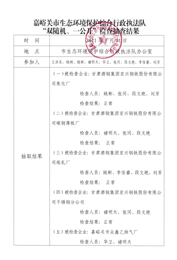 2021年1月份嘉峪关市生态环境保护综合行政执法队“双随机”检查抽查结果
