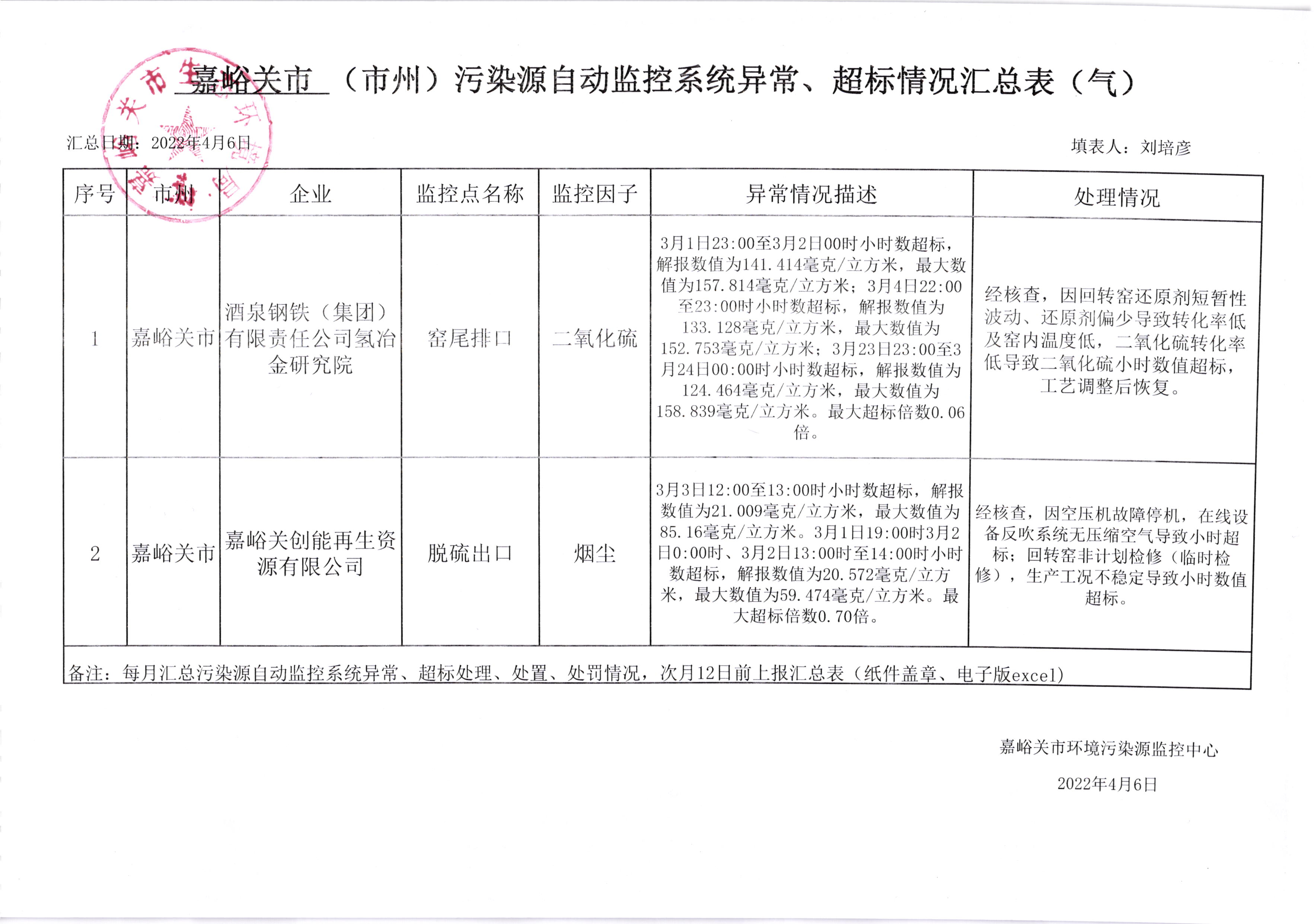 嘉峪关市污染源自动监控系统异常、超标情况汇总表(气)