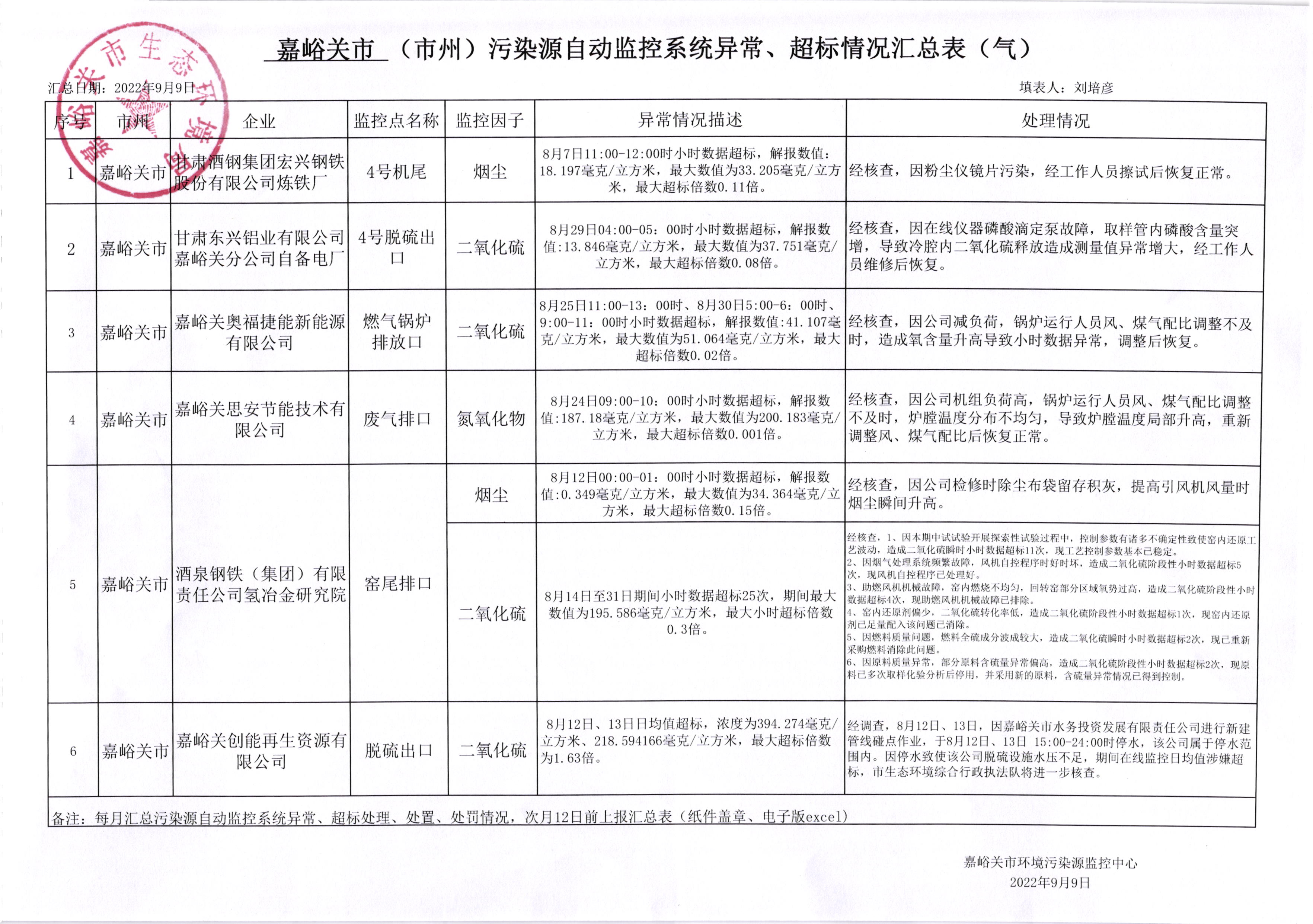 嘉峪关市污染源自动监控系统异常、超标情况汇总表(气)8月
