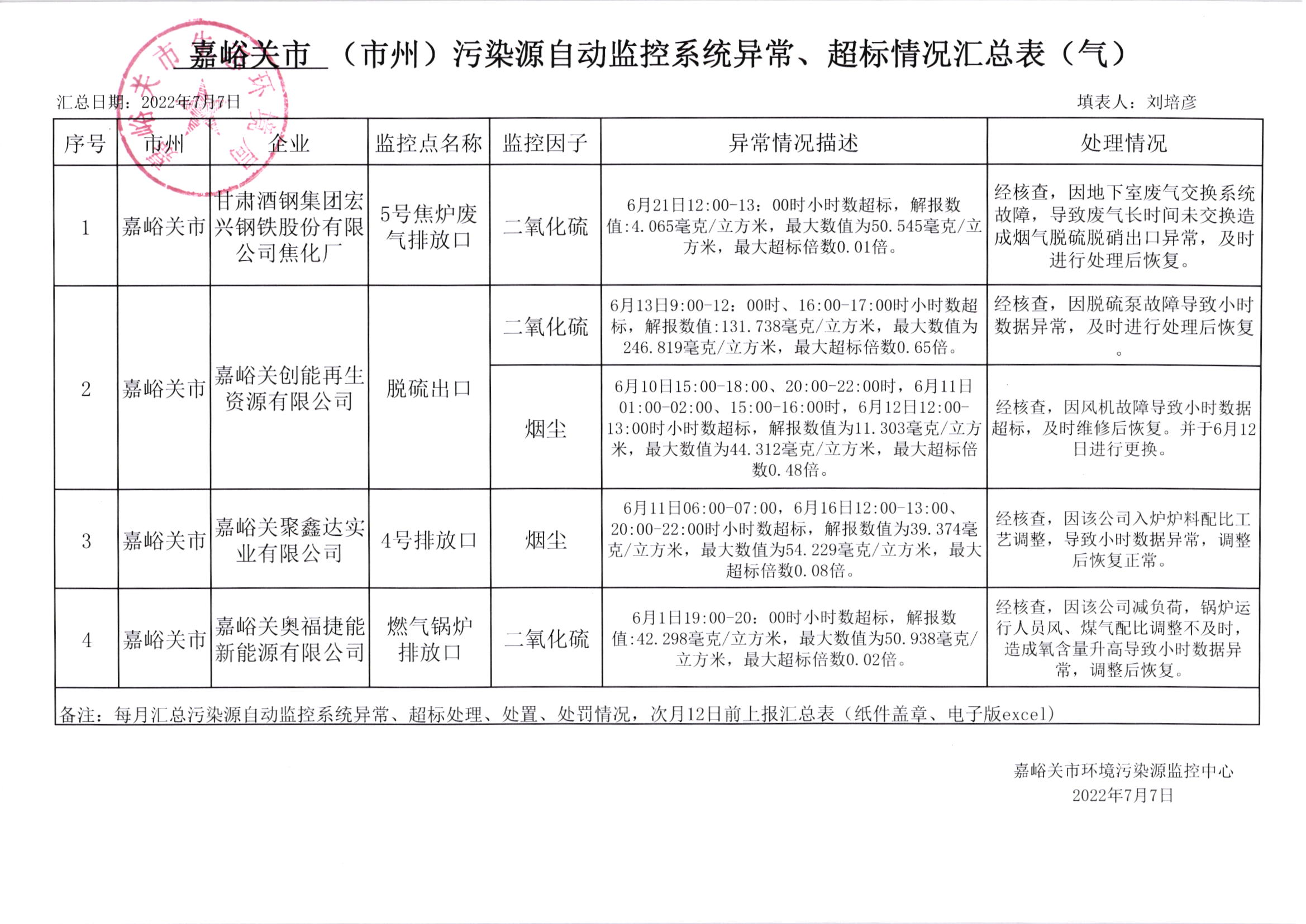 嘉峪关市污染源自动监控系统异常、超标情况汇总表(气)
