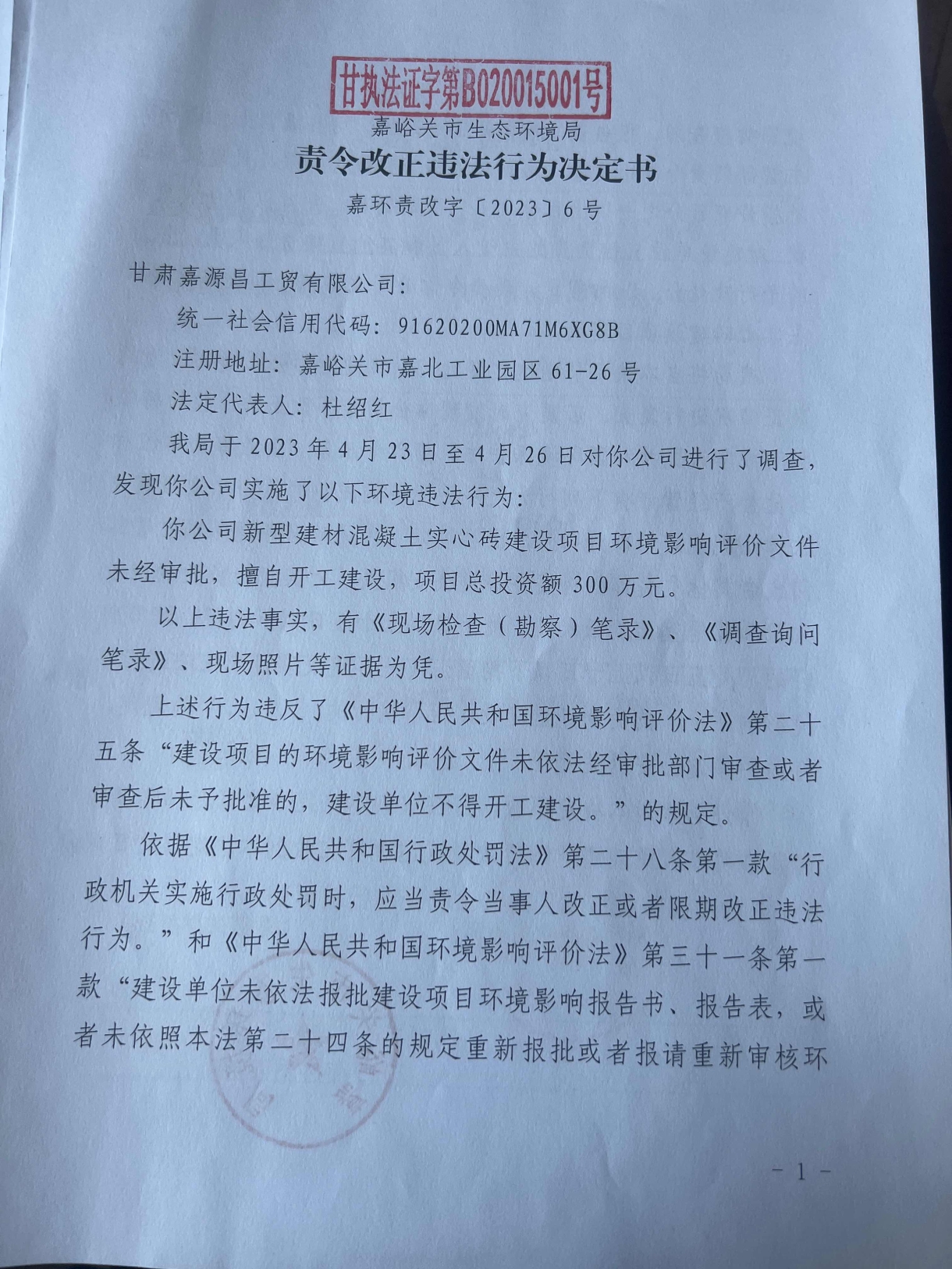甘肃嘉源昌工贸有限公司责令改正违法行为决定书(嘉环责改字[2023]6号)