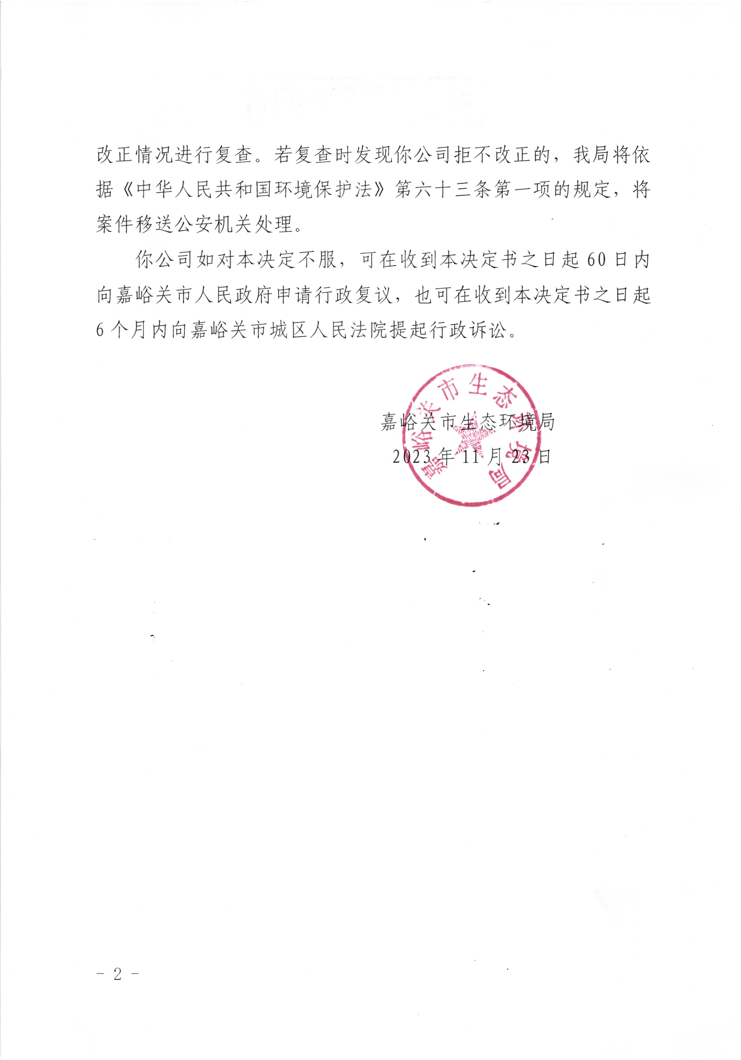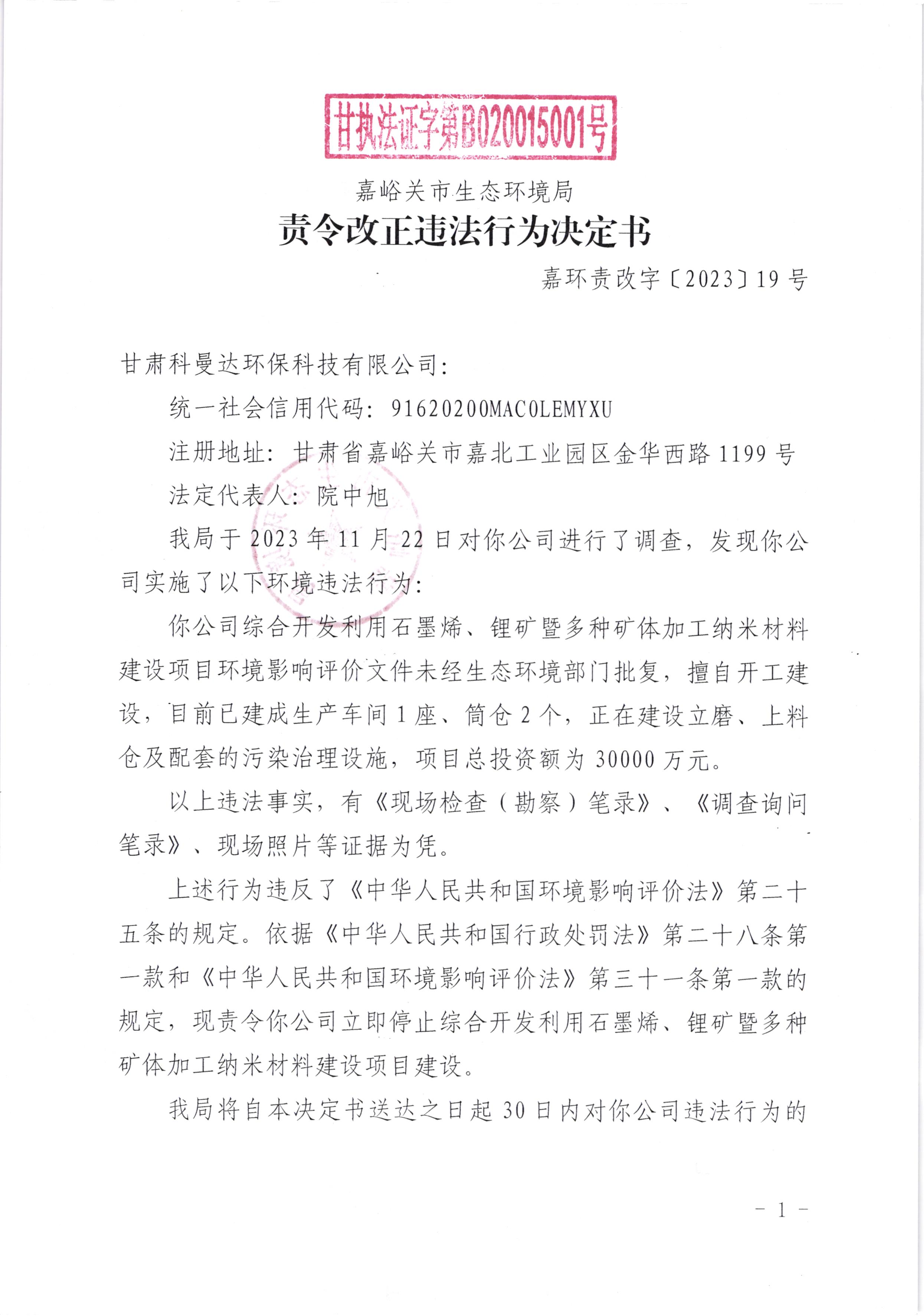 甘肃科曼达环保科技有限公司责令改正违法行为决定书(嘉环责改字〔2023〕19号)